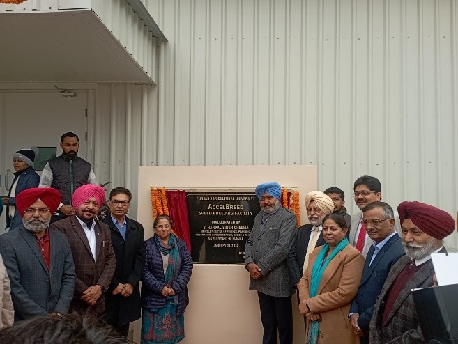 In a move to accelerate ongoing crop research programme, Punjab Agricultural University, Ludhiana unveiled the state-of-the-art speed breeding facility on 08-01-2024. This cutting-edge facility, constructed under a research project grant funded by Department of Biotechnology, Ministry of Science and Technology, New Delhi, marks a significant leap forward in agricultural innovation. Constructed by Saveer Biotech Limited, Accelbreed facility was inaugurated by Sh. Harpal Singh Cheema, Finance Minister, Punjab  in the auspicious presence of Dr. Satbir Singh Gosal, Vice-Chancellor, Dr Rishi Pal Singh, IAS, Registrar, and many other dignitaries including Deans, Directors and Heads of the departments of PAU. All the dignitaries appreciated the world class facility constructed and designed by Saveer Biotech Limited.
